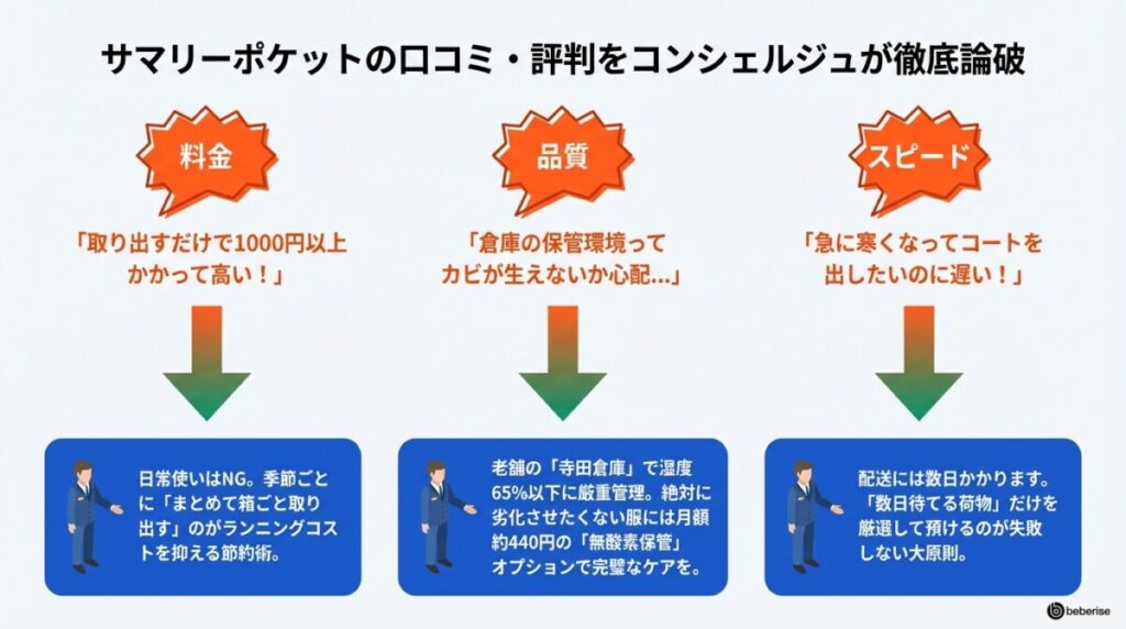 サマリーポケットを検討する際、SNSなどで悪い口コミを見て不安になる方も多いでしょう。実際に「料金が高い」「カビが心配」「届くのが遅い」といった声があるのは事実です。